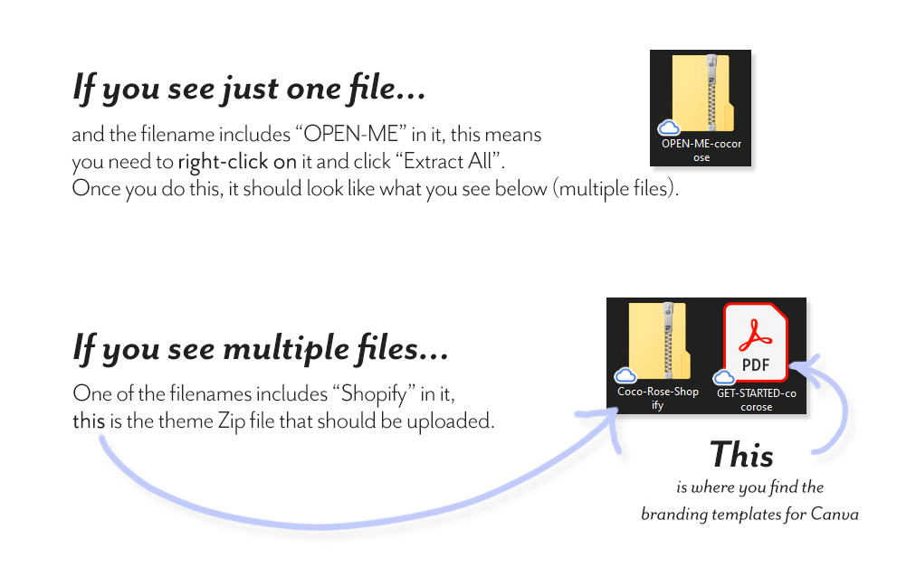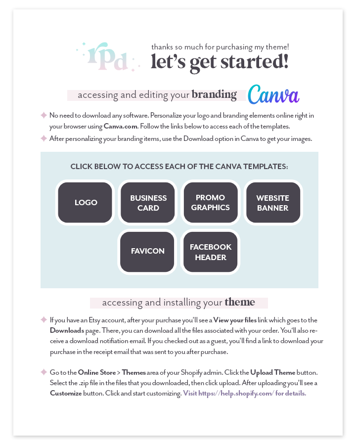 When downloading your theme files from Etsy, included in the download is a PDF file that is named "GET-STARTED-xyz" (where xyz is the name of the theme your purchased).